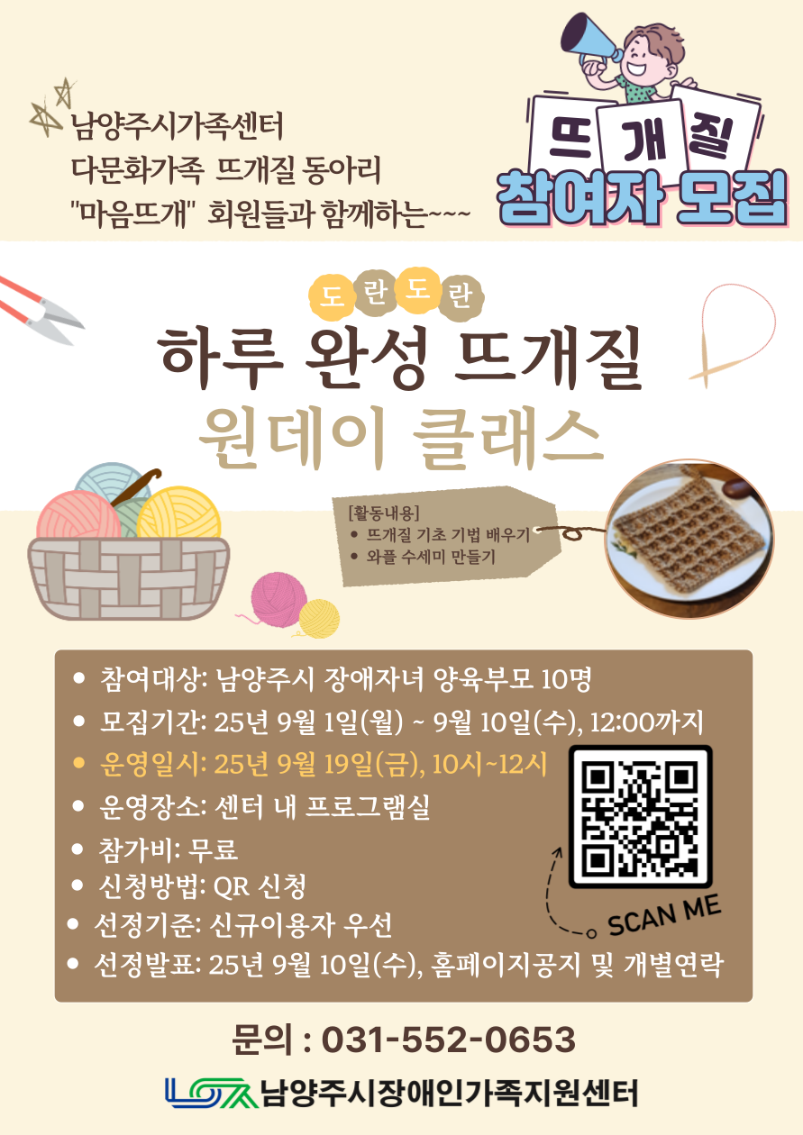 2025년 하루 완성 뜨개질 원데이 클래스 참여자 모집